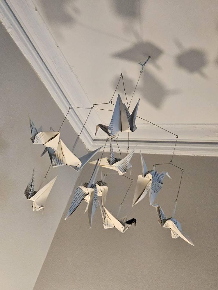Most of my products come about because I have a friend or family member I want make something special for.  The first crane mobile I made was for my cousin's new baby boy.  This mobile is different than that first one I made.  I love old books and the patina on old or vintage book pages.  I have lots of old books I have rescued from the dump and wanted another way to use the pages instead of throwing them out.